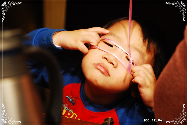 葦葦拿著路人甲叔叔送的汽球,頻頻在做餐前搞笑表演。