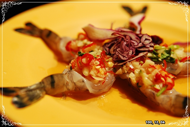 ,這泰式生蝦去殼對剖後,上面放了辣椒、蒜頭及泰式醬料。讓我難以忘懷!